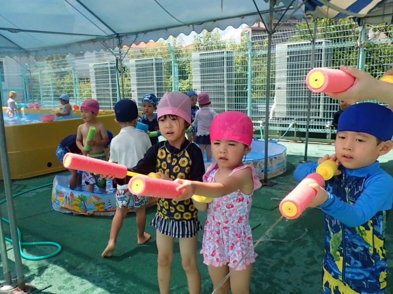 持参した お気に入りの水鉄砲を使い